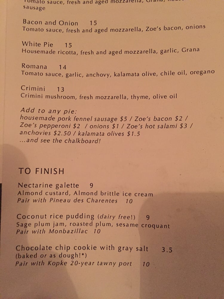 Tomato sauce, fresh and aged mozzarella, Zoe's bacon, onions